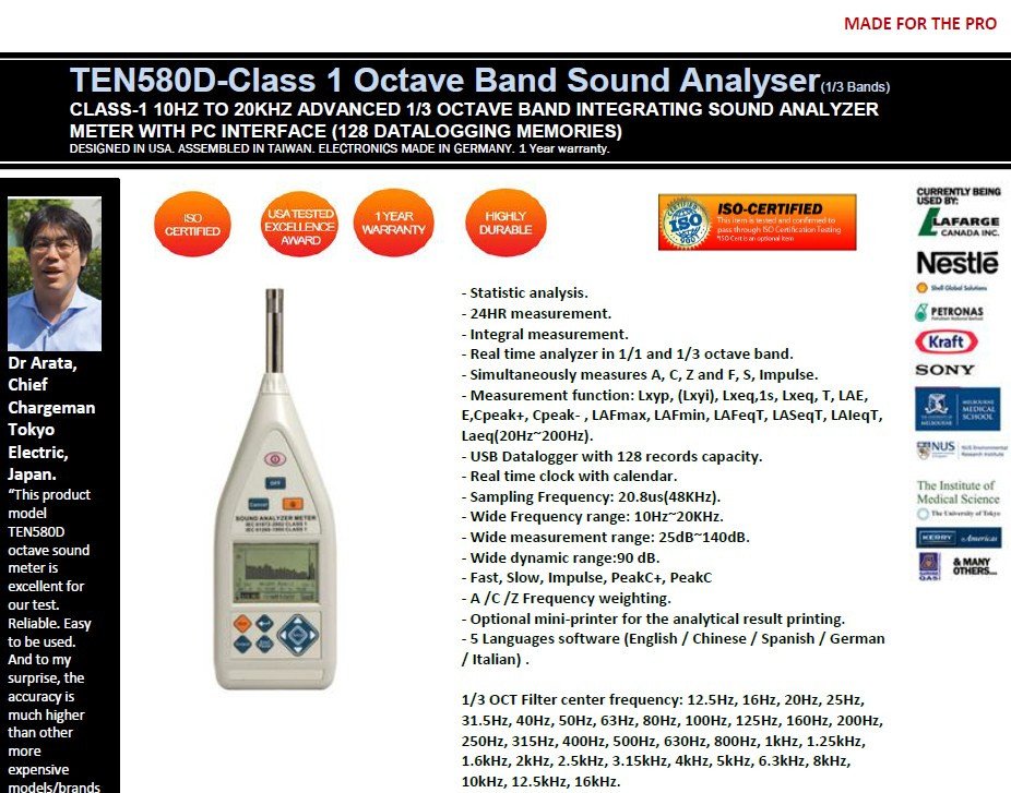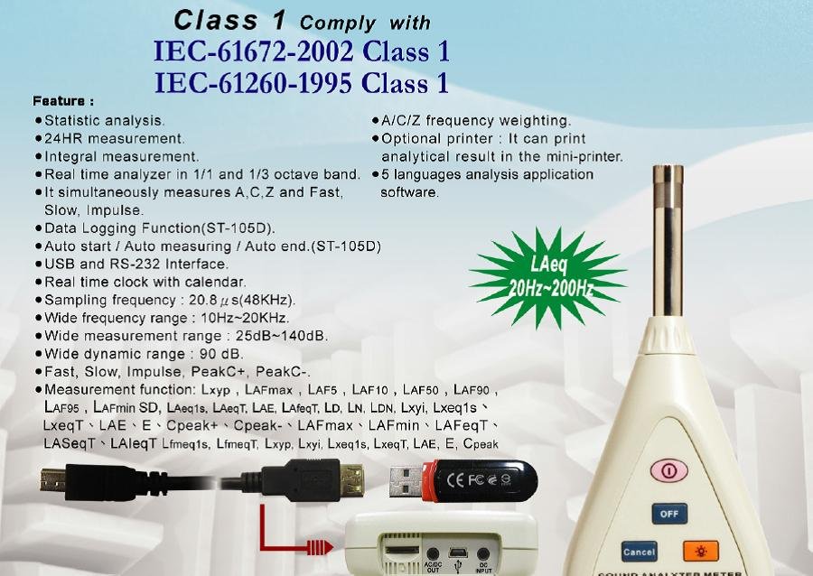 Model: TEN580D Statistic Analyses 24H Measurement Integrating * 1/1 OCT 1/3 OCT * 128 Records Storage * 12288 Records Storage Auto Storage Setup Auto Start/Auto Mease. IEC 61672-1-2002 CLASS 1 * IEC 61260-1995 CLASS 1 *
