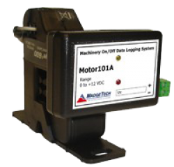 The Motor101A measures and records on and off status changes for motors or other equipment drawing up to 200 Amps. The state change occurs when the current switch exceeds the 150mA set point. This allows for most basic equipment to be monitored.