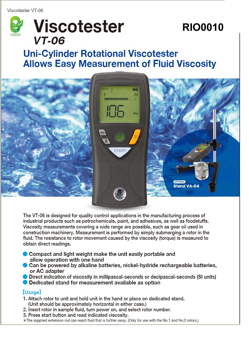 The VT is designed for quality control applications in the manufacturing process of industrial products such as petrochemicals, paint, and adhesives, as well as foodstuffs. Viscosity measurements covering a wide range are possible, such as gear oil used in construction machinery. Measurement is performed by simply submerging a rotor in the fluid. The resistance to rotor movement caused by the viscosity (torque) is measured to obtain direct readings.